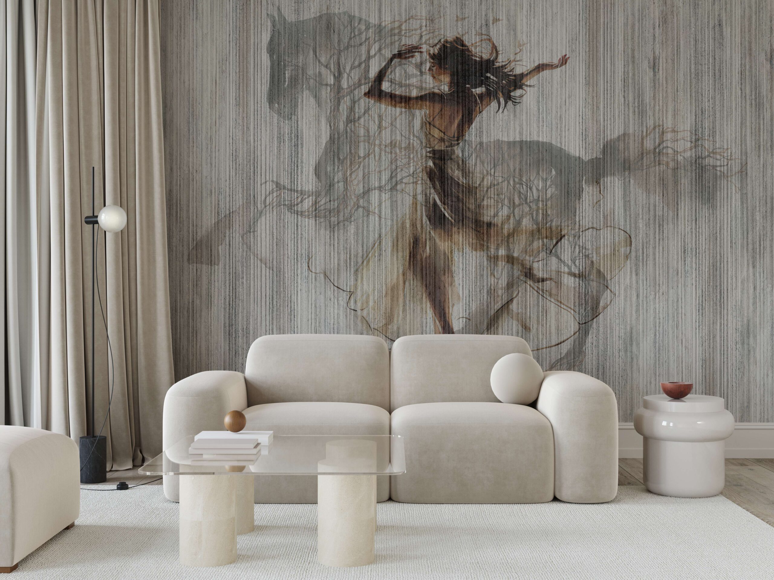 Ta in magin i subtil konst i din interiör med fototapeten ”Naturens dans”. Denna unika komposition kombinerar en kvinnlig silhuett i dansande extas med en hästs delikata kontur och organiska motiv som påminner om trädgrenar. Hela designen bibehålls i dämpade, eteriska färger, vilket introducerar lugn, poesi och konstnärligt djup i rummet.