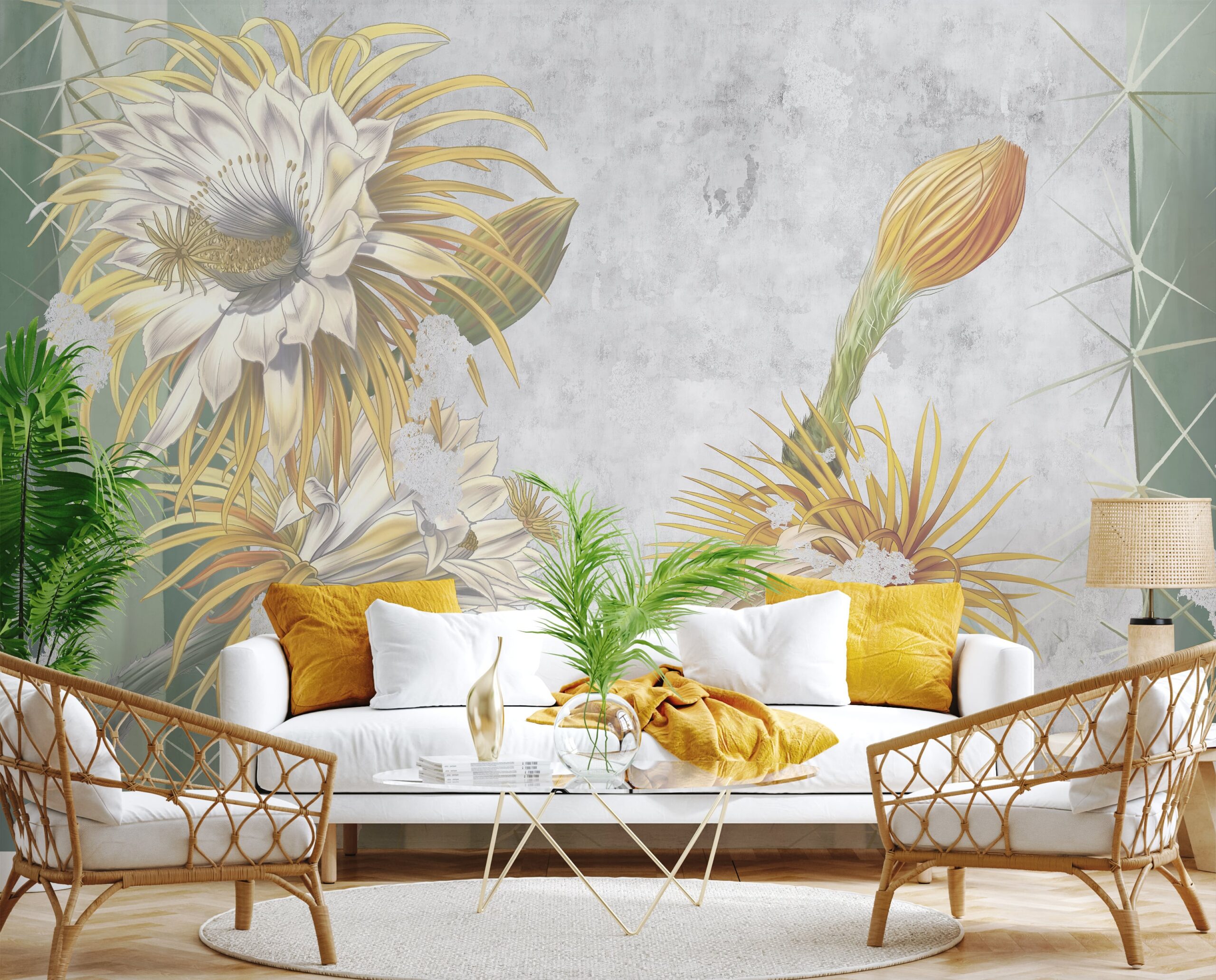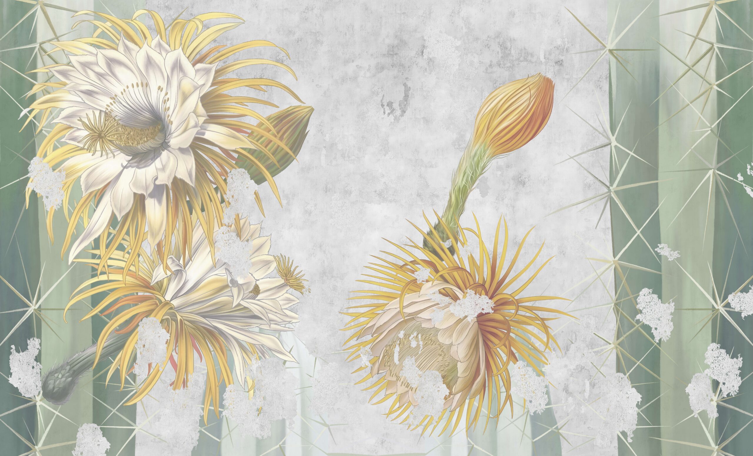 Inför en atmosfär av lugn och exotisk skönhet i din interiör med fototapeten ”Desert Glow”. Detta unika mönster avbildar blommande kaktusar i en subtil, konstnärlig tolkning, som kombinerar gyllene accenter, delikata detaljer och dämpade bakgrundsfärger. Kompositionen, inspirerad av ett ökenlandskap, ger utrymmet lätthet och en sofistikerad karaktär.