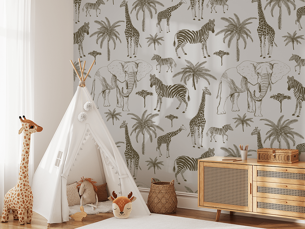 Introducera en unik atmosfär i ditt barns rum med fototapeten ”Safari in the Palms”. Detta vackert designade mönster, som avbildar exotiska djur som zebror och giraffer omgivna av palmer, kommer att förflytta barn till safarins fascinerande värld. Naturliga detaljer och vänliga färger passar perfekt in i en atmosfär full av glädje och roligt.