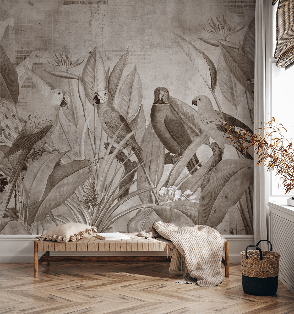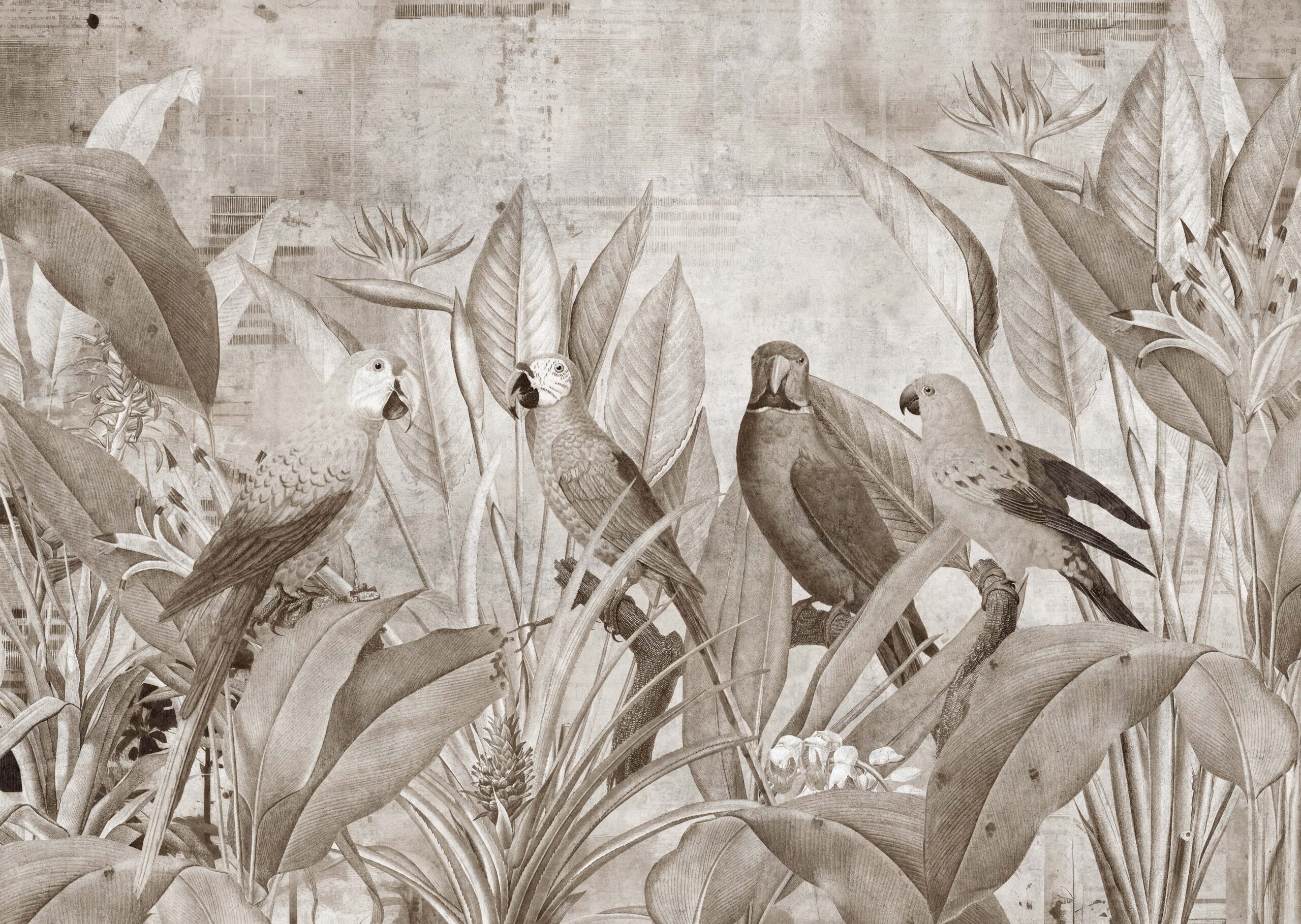 Inför en unik atmosfär i ditt hem med fototapeten ”Paradise Meeting”. Detta utarbetade, sepiatonade motiv av papegojor omgivna av frodig, tropisk vegetation framkallar atmosfären i en exotisk djungel och tillför värme och naturlig elegans till rummet. De exakta detaljerna av fåglarna och löven passar perfekt in i både klassisk och modern inredning.