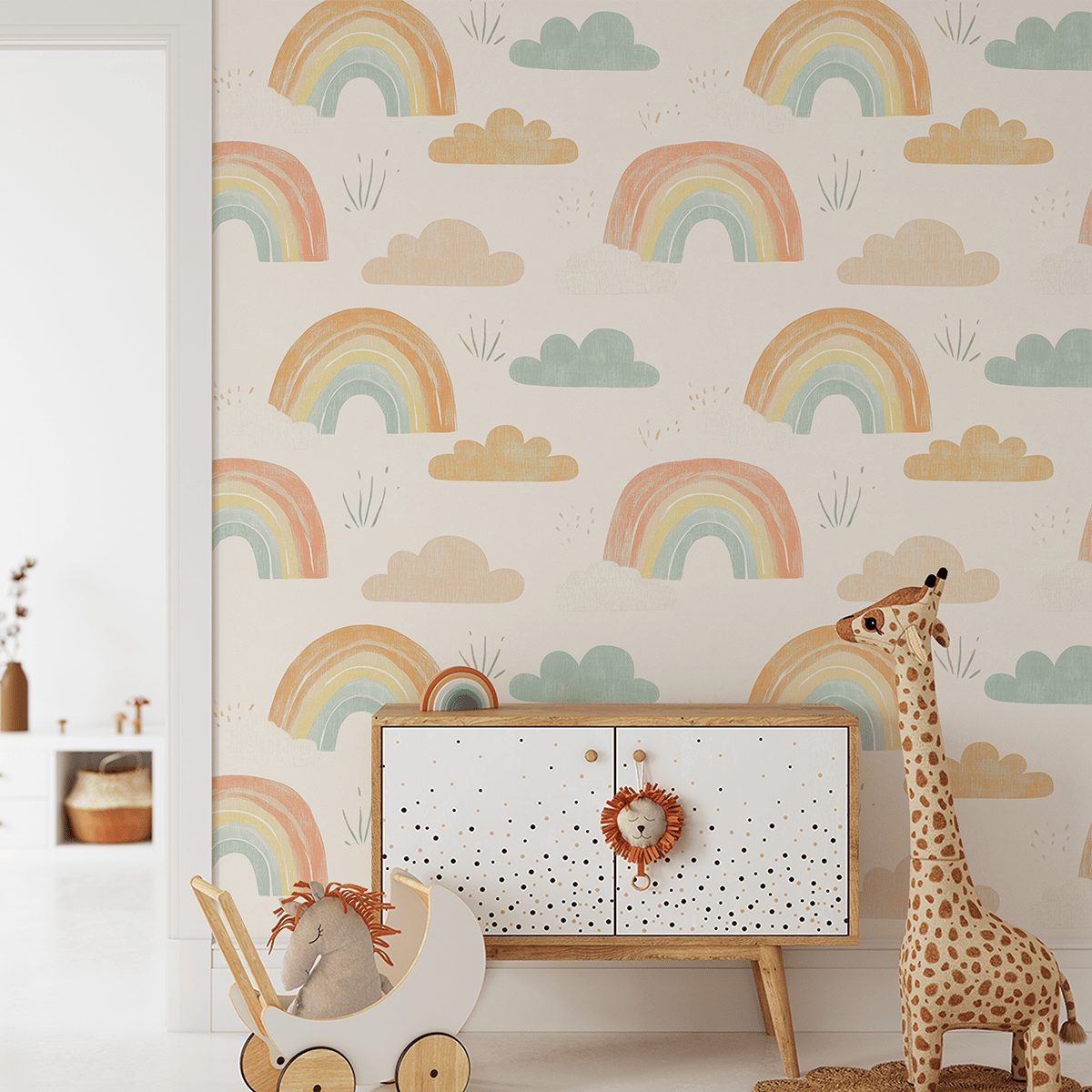Skapa en varm och vänlig atmosfär i ditt barns rum med fototapeten ”Pastel Dreams”. Detta subtila mönster med pastellfärgade regnbågar och mjuka moln skapar ett mysigt och glatt utrymme som främjar lek och fantasi. Ljusa, milda färger smälter perfekt in i barnens möbler och accessoarer, vilket ger interiören en lätt och glad karaktär.