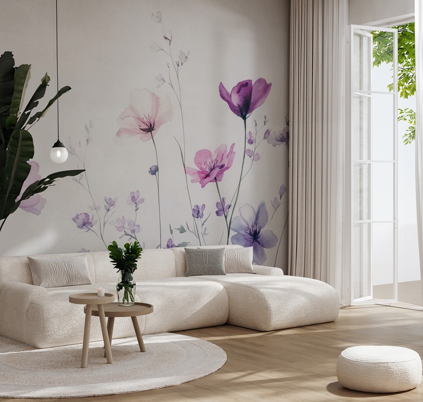 Dynamiska akvarelldetaljer och en harmonisk palett av lila och rosa skapar en atmosfär av lugn, ro och subtil romantik. Tapeten ”Purple Field Whisperers” är ett val för människor som värdesätter dekorationer inspirerade av naturen, botanisk skönhet och elegans i enkelhet.