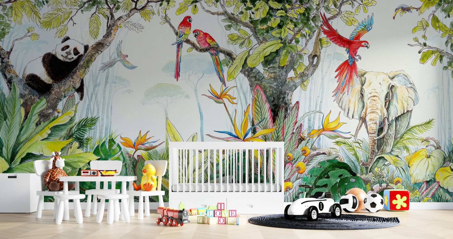 Denna väggmålning har en dynamisk scen med röda papegojor som rusar genom en tät djungel full av exotiska växter och blommor. Färgerna är livfulla och energiska och ger rummet nytt liv och karaktär.