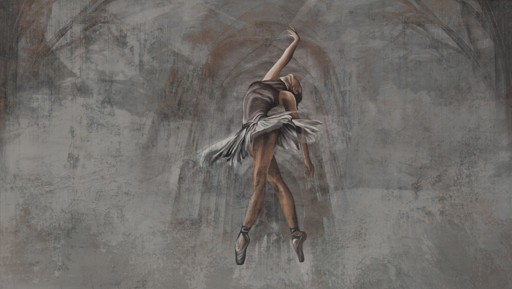 en dansande ballerina mot en blygsam bakgrund. De dämpade färgerna gör väggmålningen till en fantastisk