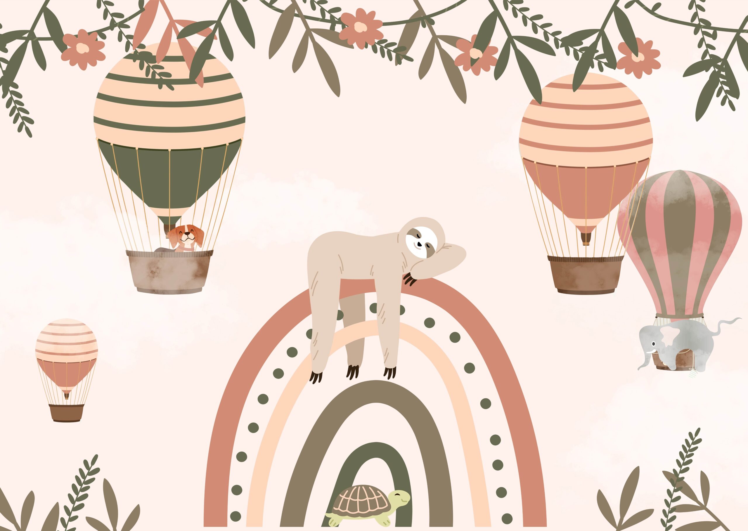 Förvandla ditt barns rum till ett magiskt land med fototapeten ”Sloth on a Rainbow”. Denna charmiga illustration avbildar en fridfull sengångare som vilar på en färgglad regnbåge, omgiven av ballonger, djur och fina pastellmoln. Subtila, varma färger och vänliga motiv skapar den perfekta bakgrunden för lek, sömn och drömmar.