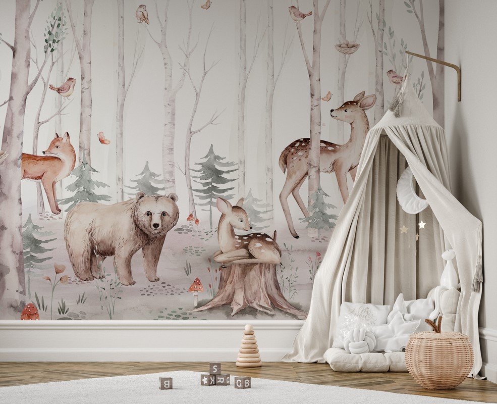 Detta är ett perfekt val för dig som värdesätter en kombination av mysighet, inspirerande natur och minimalistisk stil. Tapeten ”Skogsdjur i ett delikat landskap” passar bra i skandinaviska, bohemiska och moderna interiörer och ger liv, en mild estetik och ett subtilt djup.