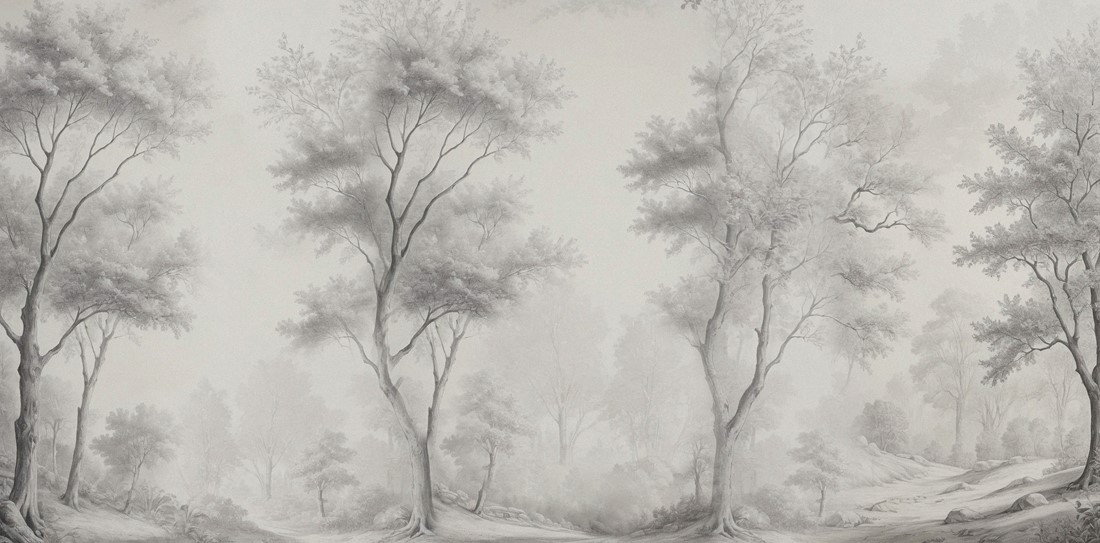 Effekt av rymd och djup – motivet med skogsvägen förstorar optiskt väggen och interiören.