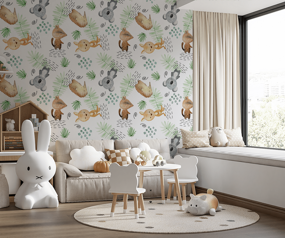 Liv upp din interiör med fototapeten ”Forest Cuties from the Antipodes” – full av värme, glädje och sagolik charm. Detta unika mönster med handmålade djur från australiensiska skogar – en koala, en känguru, en myrpiggsvin och en bandicoot – transporterar dig till ett barns fantasivärld och en natur full av harmoni. En pastellfärgpalett, akvarellblad och subtila detaljer skapar en lugn men ändå glad atmosfär.