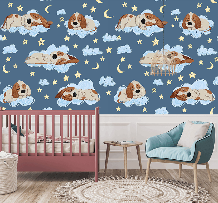 Förvandla ditt barns rum till en mysig plats full av lugn och leenden. Tapeten ”Sovande hundar” är en charmig syn av små valpar som myser tillsammans och vilar efter en dag full av skoj. Deras fridfulla sömn är lugnande och skapar en varm, trygg atmosfär perfekt för att somna.