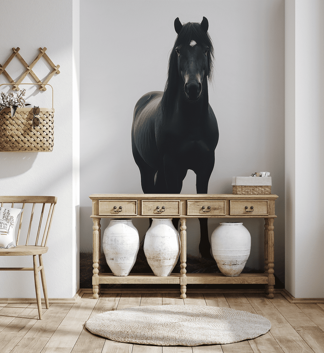 Introducera en unik atmosfär i din interiör med fototapeten ”Black Horse”. Denna rörliga, djupa komposition visar kraften och skönheten hos en häst som står mot en bakgrund av delikat dimma, vilket skapar en bild full av lugn och vild natur. Den kontrasterande kombinationen av en mörk silhuett mot en ljus bakgrund lockar ögat och introducerar en touch av mystik och elegans i rummet.