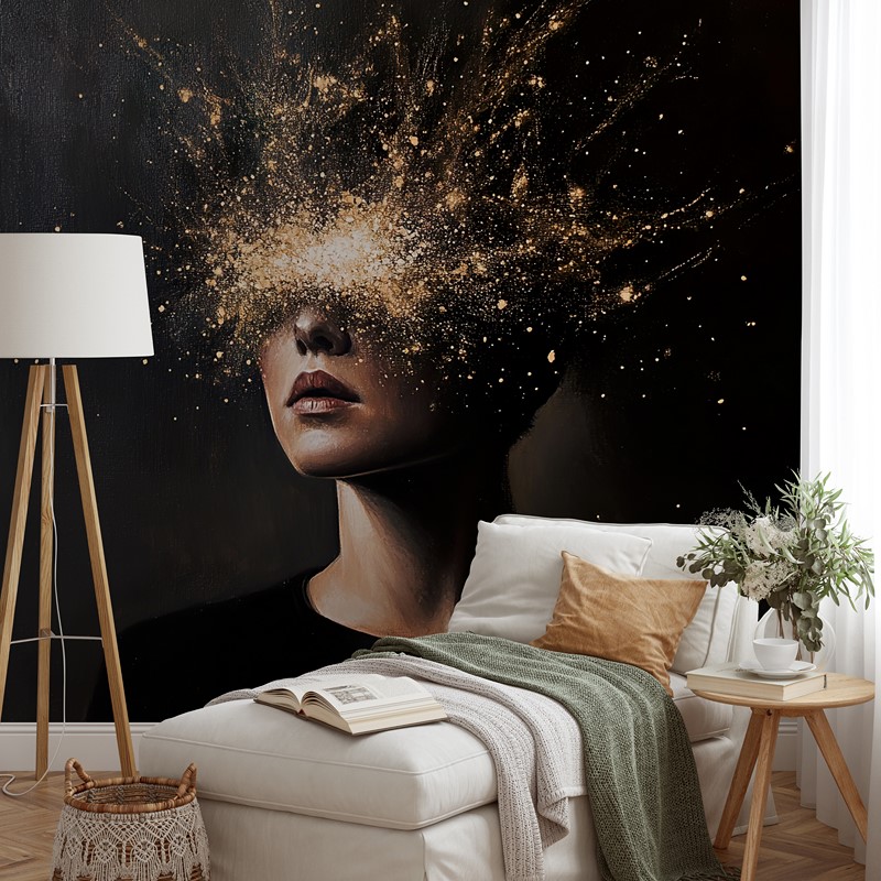 Fototapeten ””Tanktexplosion”” är en dynamisk och inspirerande väggdekoration som ger konstnärligt uttryck och en kreativ impuls till din interiör. Abstrakta kompositioner på den övre delen av en kvinnas ansikte avbildade som gnistor, fläckar och suddiga former som symboliserar strömmar av tankar och känslor – perfekt för kreativa utrymmen, ett kontor, vardagsrum eller ett tonårsrum. Perfekt för dig som värdesätter design inspirerad av rörelse, uttrycksfulla färger och modern estetik. ”Tanktexplosion”” kommer att liva upp vilken interiör som helst och ge karaktär, djup och konstnärligt temperament.