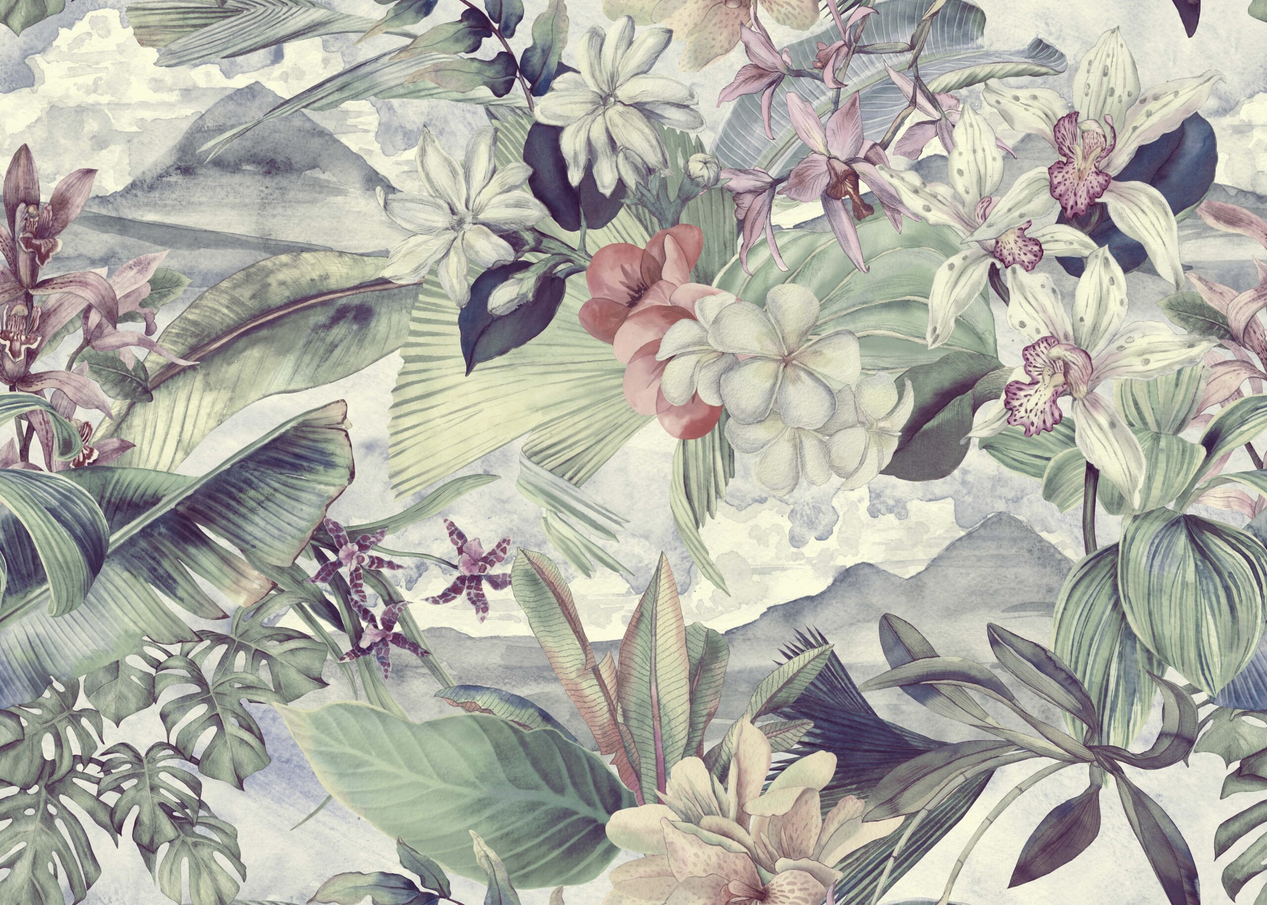 Ge ditt hem en unik atmosfär med fototapeten ”Breath of Tropics”. Detta intrikat utformade mönster med tropiska löv och blommor i subtila pastellfärger framkallar atmosfären av en exotisk djungel och ger utrymmet fräschör och harmoni. Fina detaljer och en naturlig färgpalett passar perfekt in i både moderna och klassiska arrangemang.