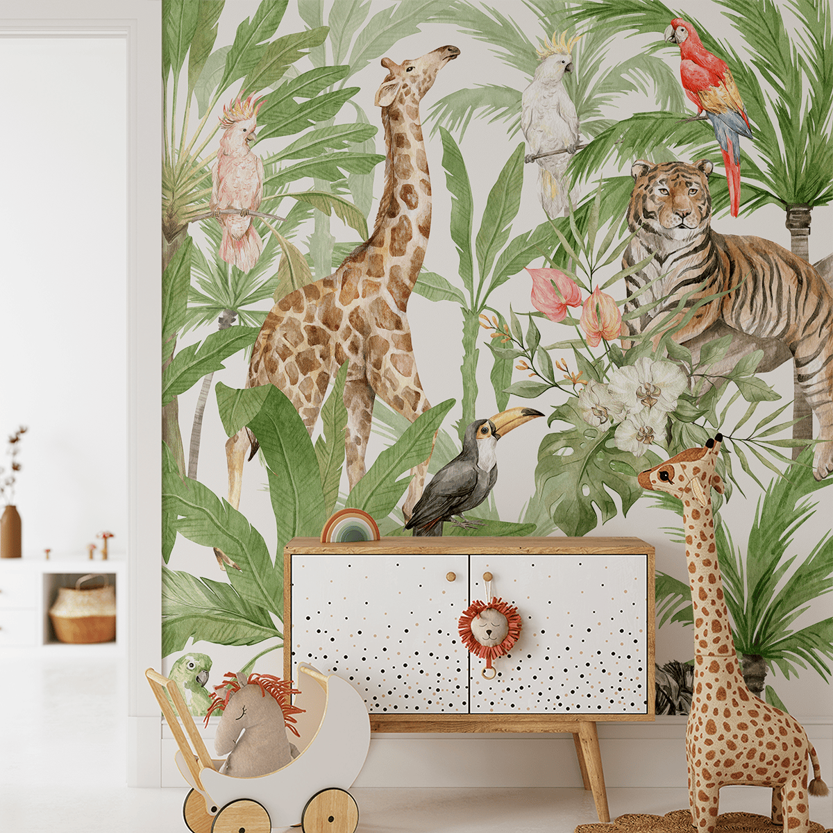 Dyk ner i tropikens magiska värld med fototapeten ”Tropical Odyssey”. Full av färger och ovanliga djur transporterar denna fototapet dig till en djungel som domineras av exotiska fåglar, magnifika växter och vilda djur som zebror, giraffer och tigrar. Varje detalj i denna unika dekoration kryllar av liv och skapar en glädjefylld atmosfär full av äventyr och upptäckter.
