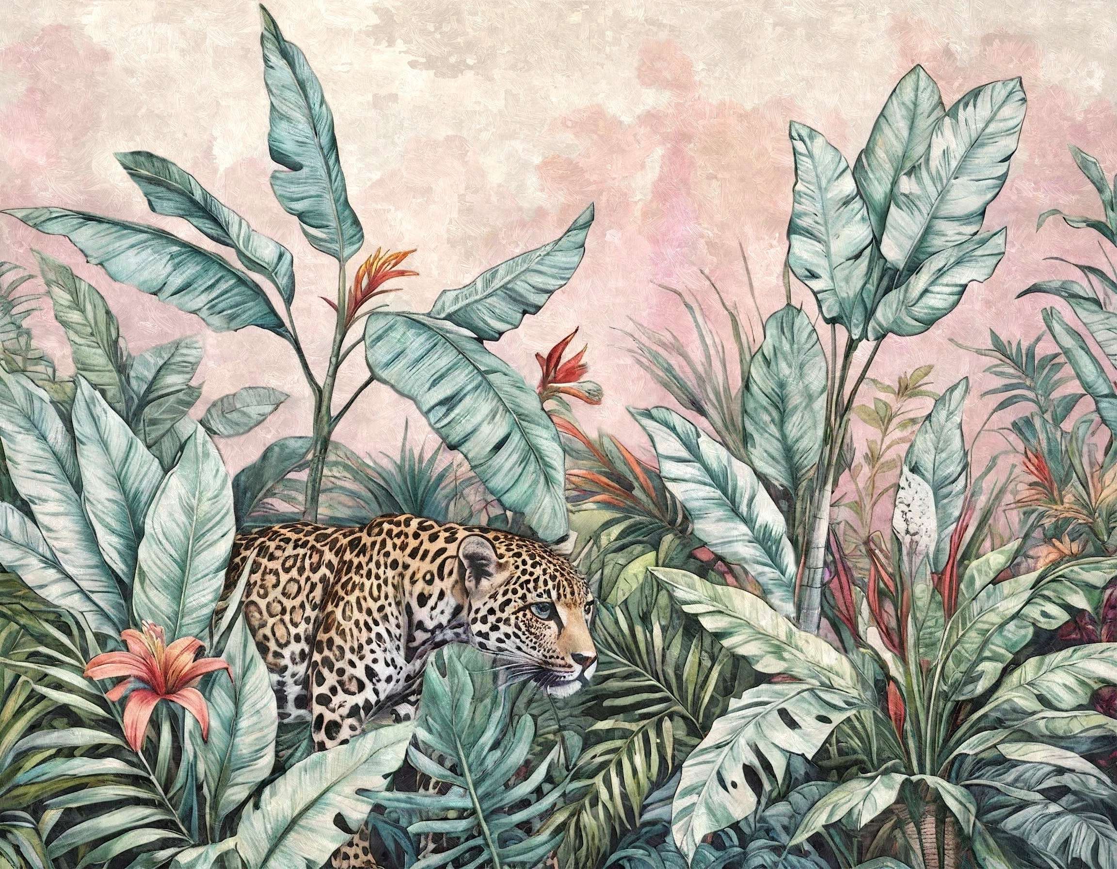 Ta med den sensuella rytmen i den tropiska djungeln till ditt hem med fototapeten ”Tropisk vakenhet”. Denna unika kombination av frodig vegetation och den majestätiska silhuetten av en leopard skapar en komposition full av spänning, harmoni och naturlig skönhet. Handmålade löv i nyanser av grönt och blått, bryts av bakgrundens subtila rosa, och skapar atmosfären i ett vilt, men sofistikerat utrymme.