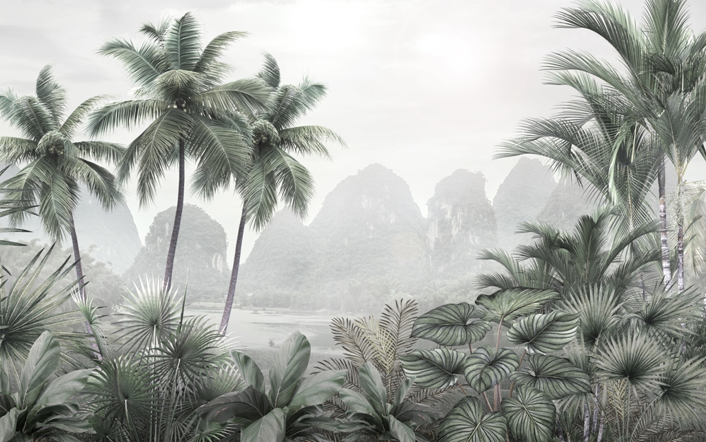Transportera dig till en värld av exotiska landskap med denna extraordinära väggmålning som visar tropiska berg bakom dimma. Denna mystiska miljö kommer garanterat att ge charm åt alla interiörer och få dig att känna dig som om du befinner dig på andra sidan jorden.