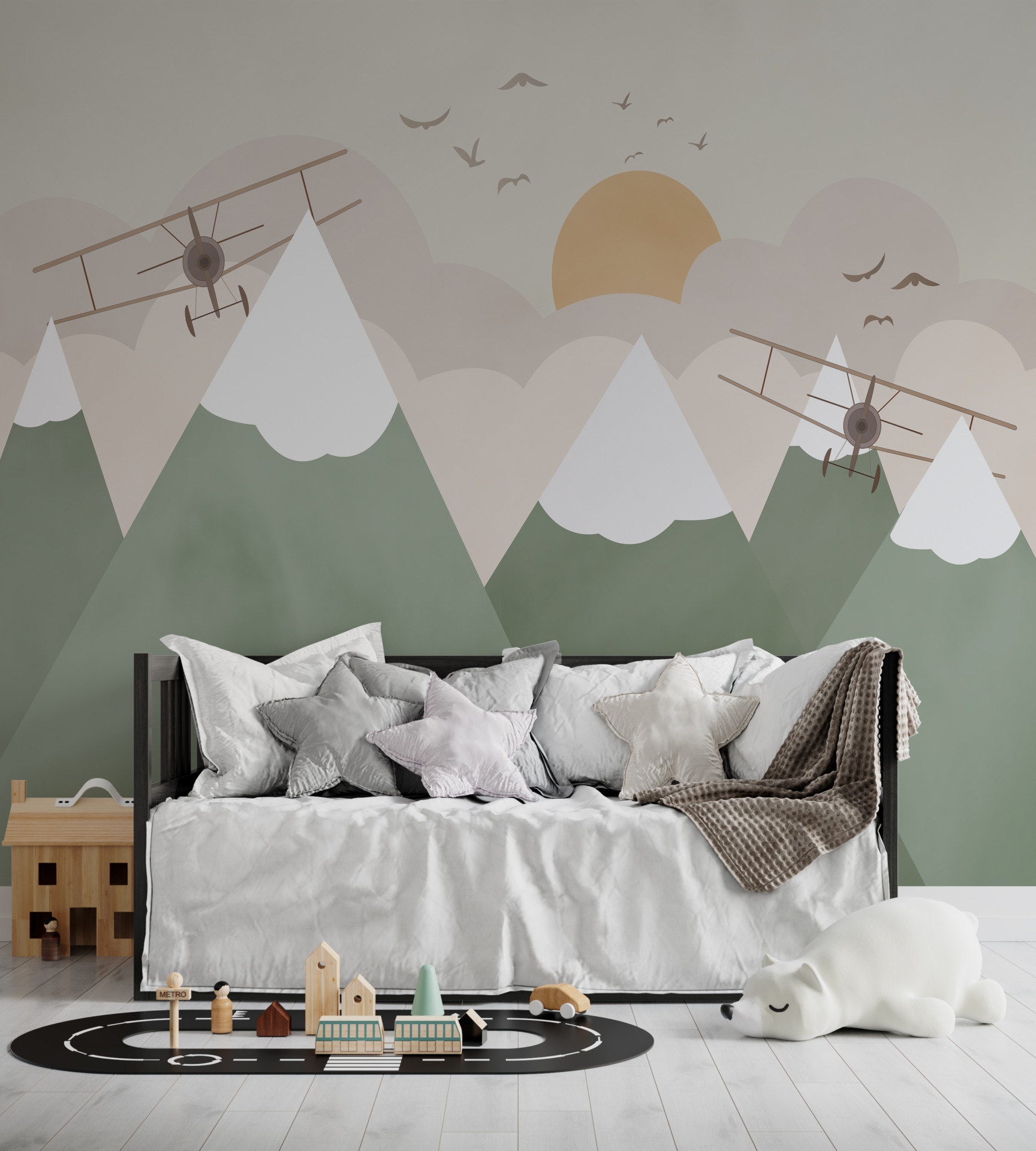 Ge nytt liv till ditt utrymme och lägg till en spännande atmosfär med väggmålningen ”Two Planes Over the Mountains”.