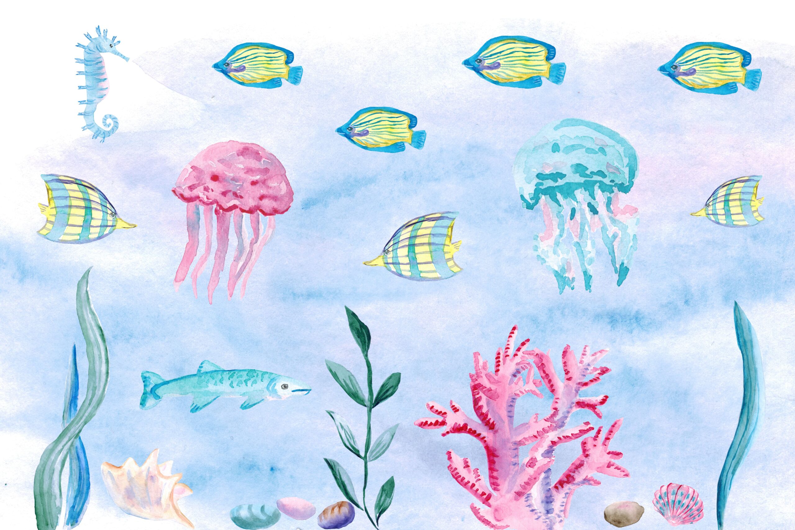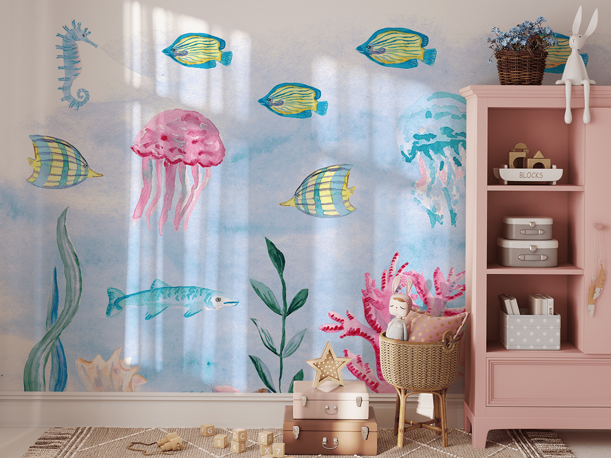 Dyk ner i havets magiska värld med fototapeten ”Undervattenssymfoni”! Denna färgglada, handmålade illustration transporterar de yngsta till ett undervattensland fullt av glada fiskar, maneter, sjöhästar och koraller. Fina akvarelltoner och charmiga havsdjur stimulerar fantasin och ger en atmosfär av bekymmersfritt havsäventyr till ett barnrum.