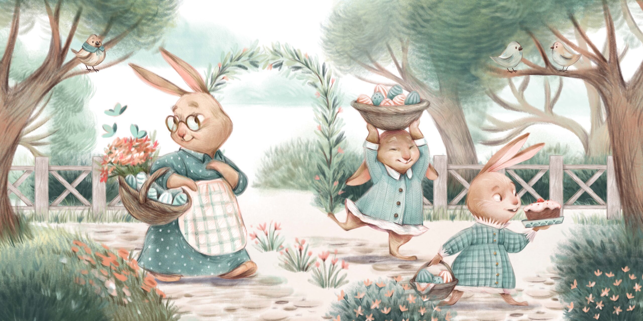 Fototapeten ”Spring Bunnies” – Glädjefylld lek, vårstämning och en charmig dekoration för ett barnrum