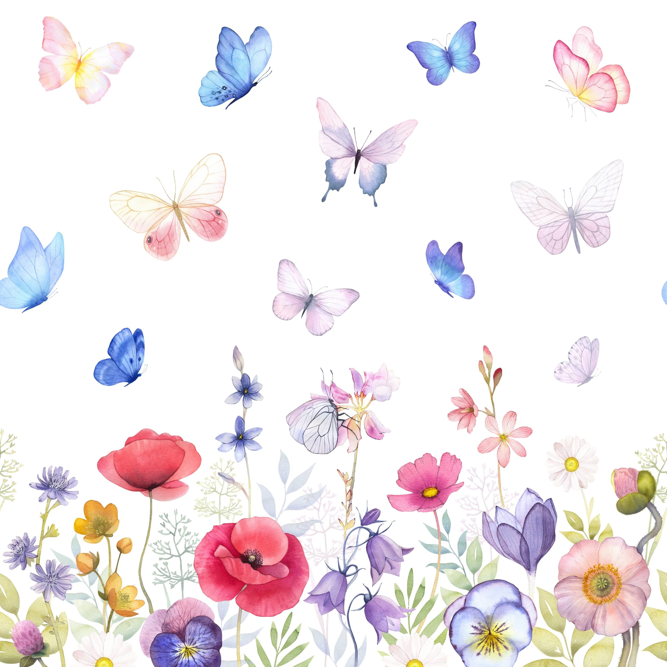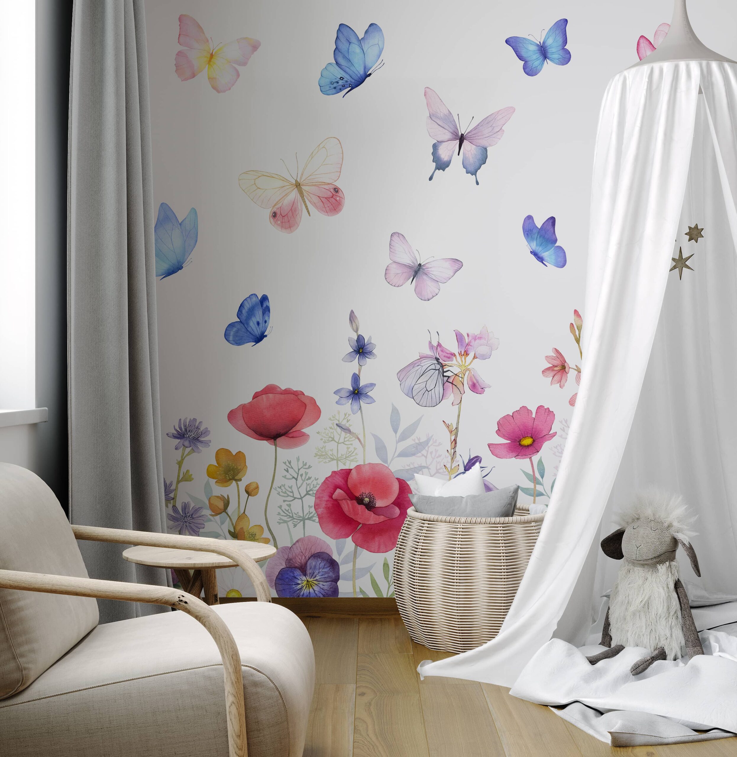 Fototapeten ”Spring Symphony” – ett glädjefyllt och färgstarkt utrymme fullt av fjärilar och blommor, som ger ett barns magi och fräschör till rummet.
