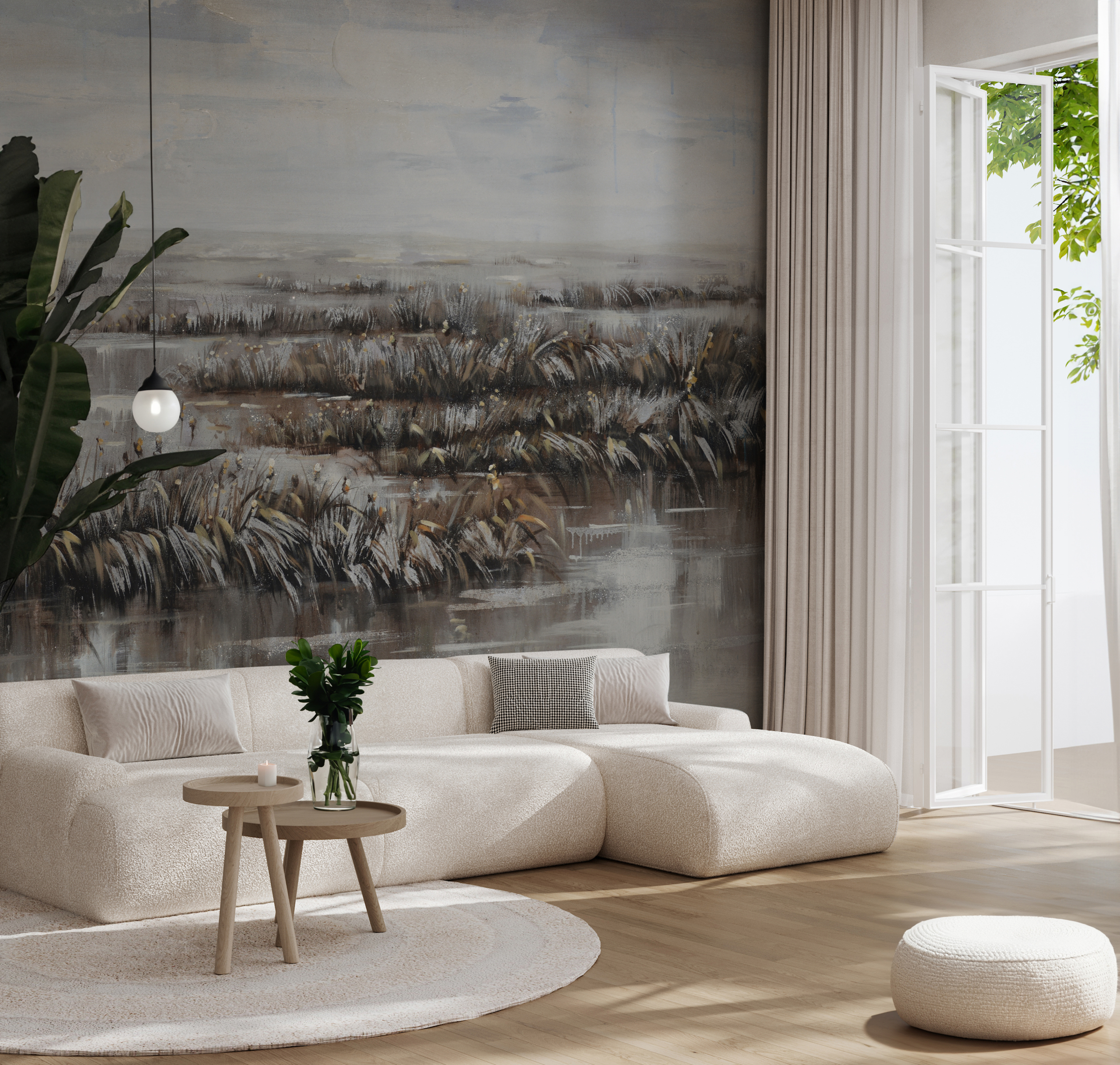 Inför en unik atmosfär av kontemplation och frid i din interiör med fototapeten ”Våtmarkernas tystnad”. Denna atmosfäriska komposition, inspirerad av vild natur, visar vidsträckta myrar höljda i dimma och gräs som speglas i vattnet. Subtila färgövergångar baserade på nyanser av grått, brunt och blått skapar en atmosfär av tystnad och stillhet, perfekt lämpad för moderna, skandinaviska och minimalistiska interiörer.