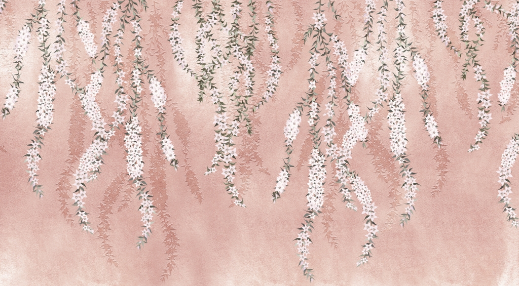 Skapa en mysig atmosfär i din inredning med denna charmiga väggmålning med vita blommor på en rosa bakgrund. Det skira blommotivet är perfekt för sovrummet, flickrummet eller vardagsrummet och ger rummet en ljus och fräsch känsla.