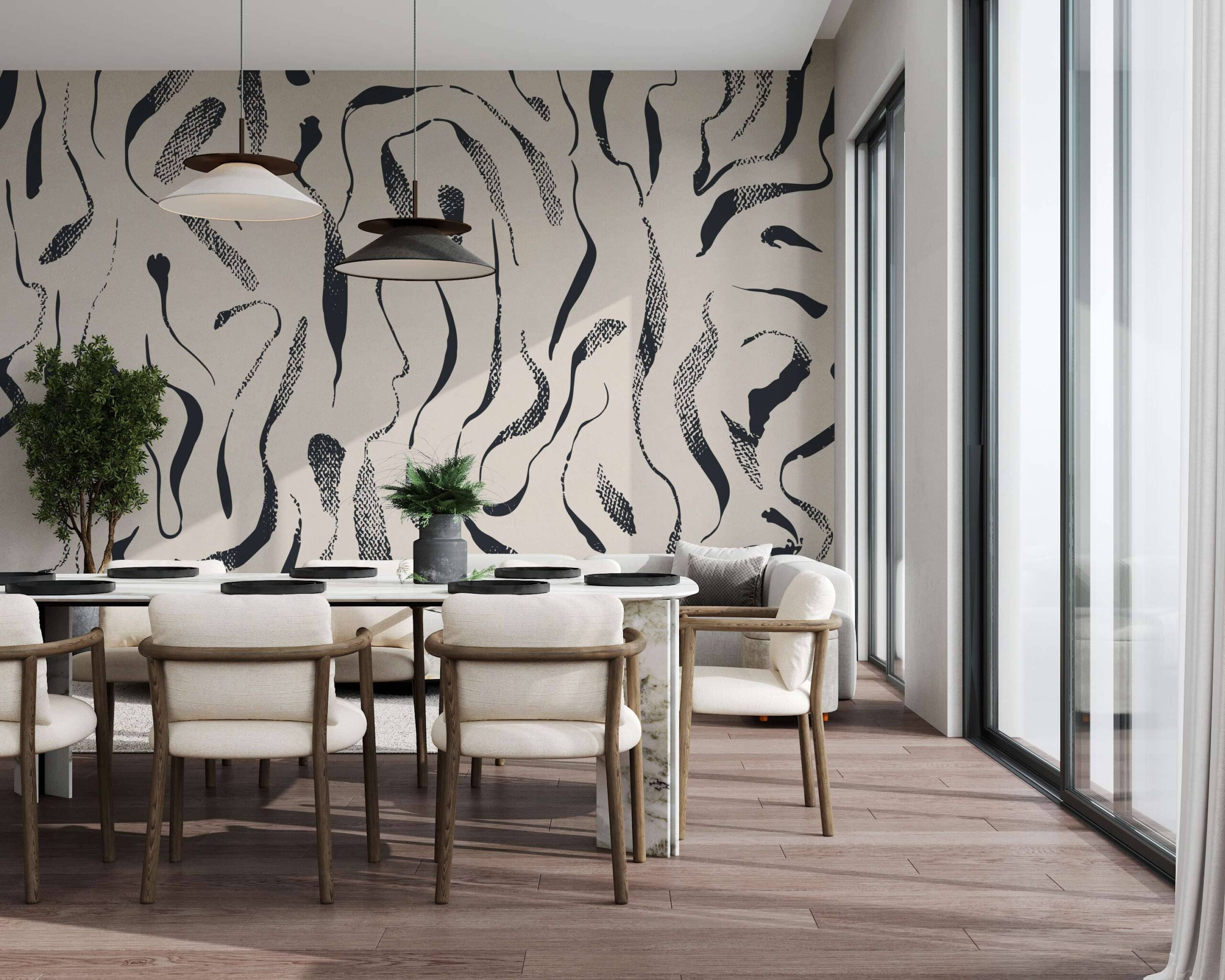 En fototapet är mer än bara dekoration – det är ett perfekt sätt att introducera modern abstraktion och konstnärlig finess i en interiör, vilket ger utrymmet en unik och kreativ dimension.