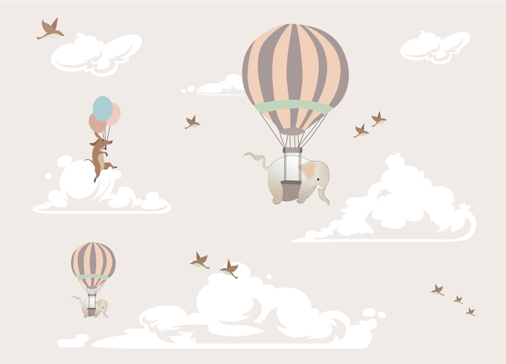 Denna väggmålning har bland annat fåglar, fjärilar och andra djur som flyter i den ljusblå himlen. Deras delikata former och pastellfärger gör att hela miljön ser mycket charmig ut och blir en riktig väggdekoration.