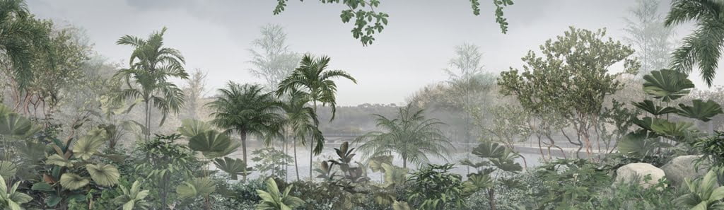 Sjön är dold bland exotiska träd som kommer fram i förgrunden. Olika nyanser av grått, dämpat grönt och brunt dominerar. Detta är en lämplig fototapet för alla som älskar jordfärger och natur, liksom för dem som tycker om att koppla av i