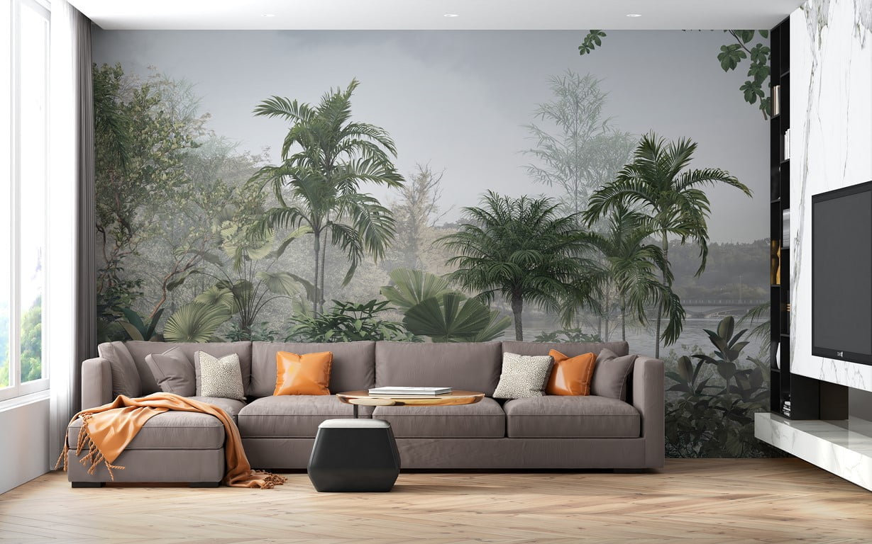 Transportera dig själv på en exotisk resa till en tropisk djungel med denna extraordinära väggmålning som visar en mystisk sjö omgiven av frodig vegetation.