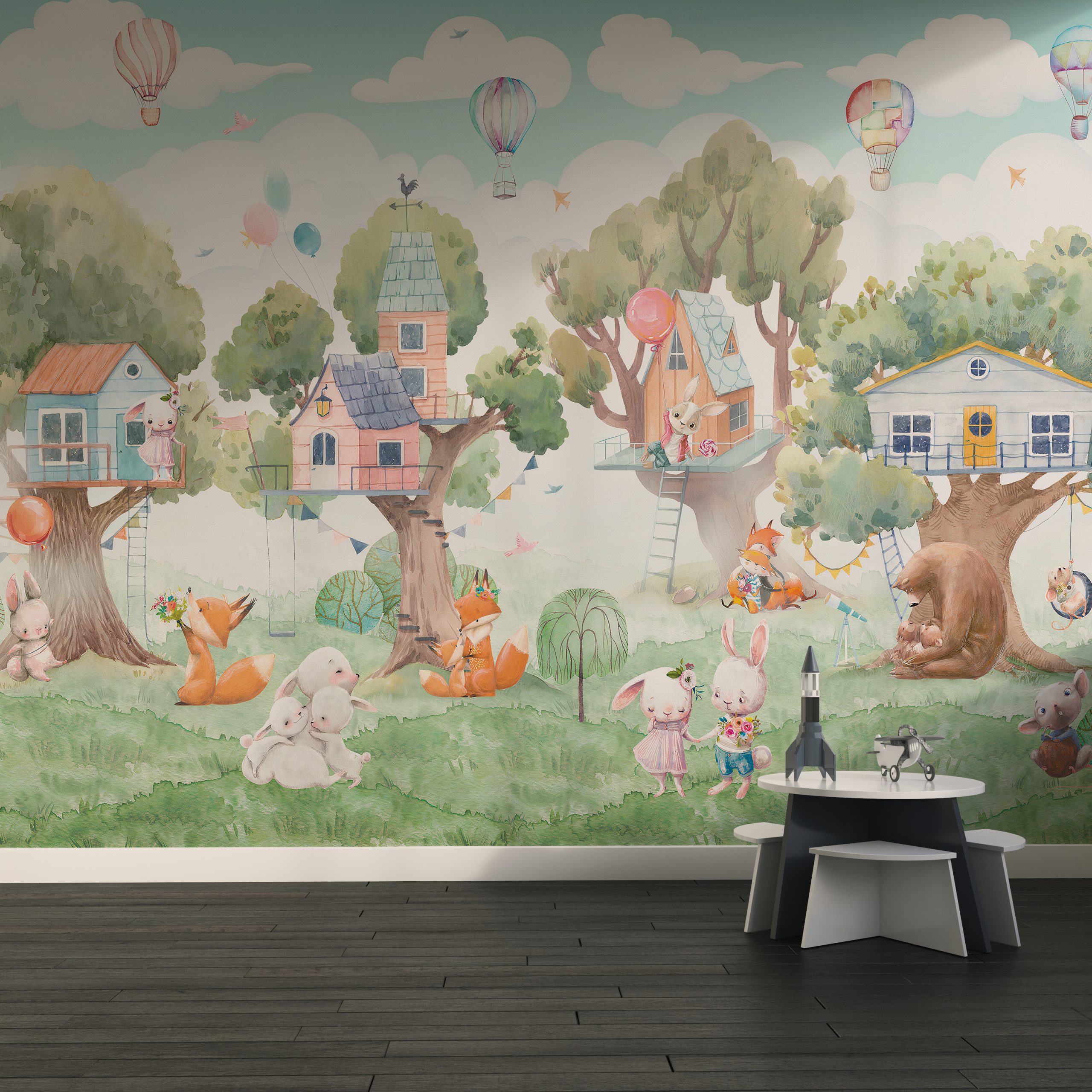 Beskrivning: ”Tree Houses” väggmålning är det perfekta sättet att skapa en magisk atmosfär i ditt hem. Med den realistiska bilden av trähus placerade i träden kommer du att känna dig som om du befinner dig i en riktig sagoskog.