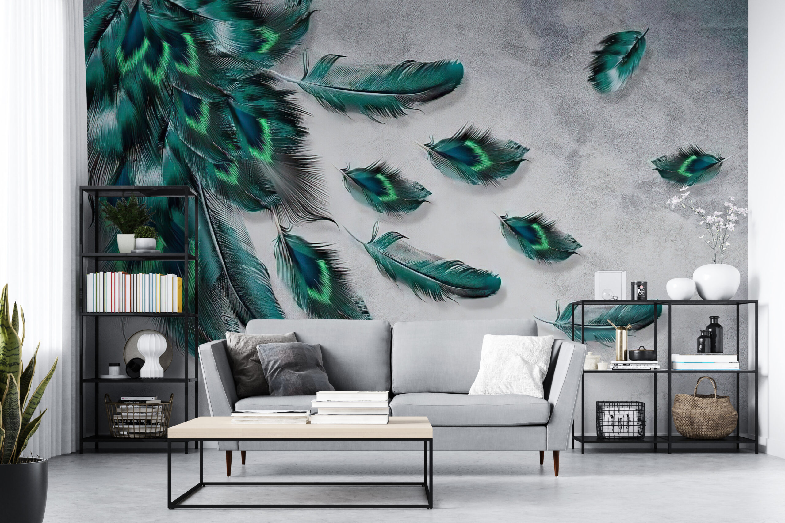 Peacock Feather Green väggmålning är ett extremt elegant tillskott till din interiör. Med ett underbart mönster som föreställer grönska och påfågelfjädrar kommer denna tapet att ge rummet mjukhet och elegans. Den passar perfekt i vardagsrummet, sovrummet, arbetsrummet eller på kontoret.