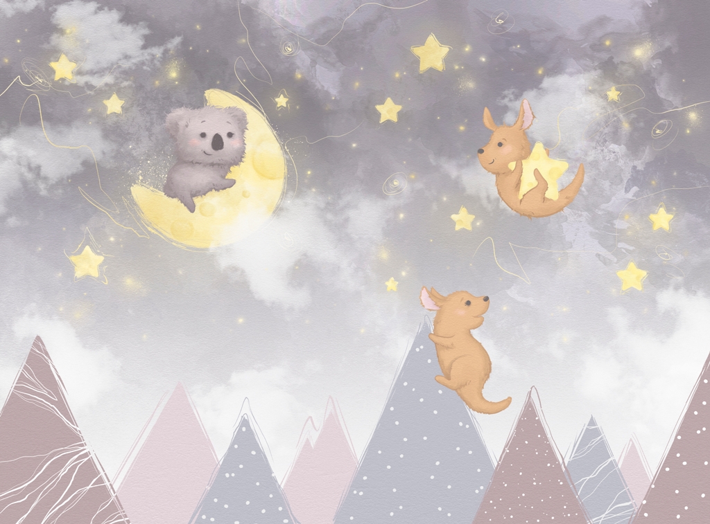 Målningen föreställer majestätiska berg som lyses upp av stjärnljus och månsken. Färgerna är dämpade och känsliga, vilket gör bilden perfekt för ett barnrum. Med den här designen kommer det lilla barnet att känna sig som hjälten på sin egen resa till bergen.