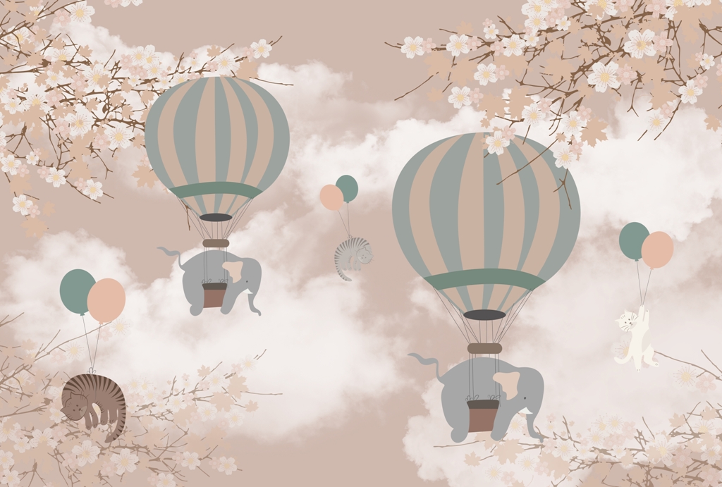 I denna väggmålning kan du se majestätiska elefanter som svävar i luften över en vidsträckt savann. Deras massiva silhuetter kontrasterar mot den mjuka himlen och bergen i bakgrunden, vilket skapar en magisk och känslosam atmosfär.