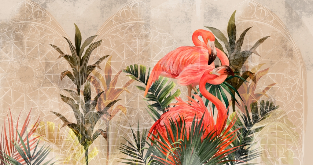 Denna högkvalitativa väggmålning avbildar ett pittoreskt landskap med pelikaner i en arkad. Tack vare det originella motivet får alla rum en ny, exotisk karaktär.