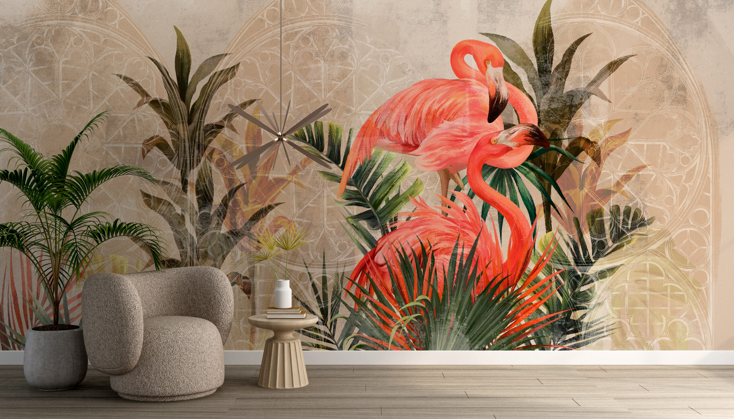 En arkad med pelikaner mot en bakgrund av vackra solnedgångar gör varje interiör unik och charmig. Den är perfekt för både bostäder och kontor.