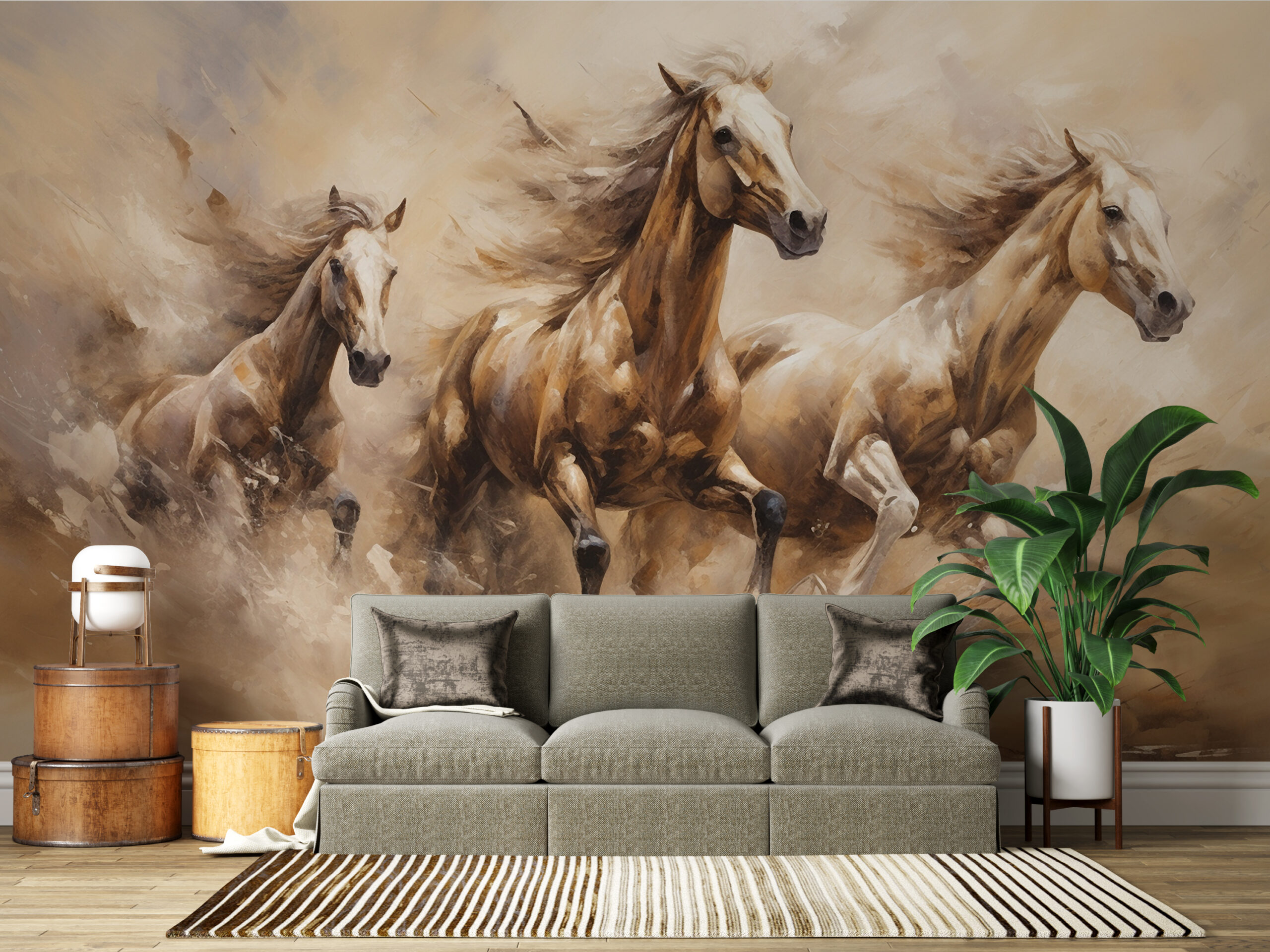 Denna fantastiska väggmålning visar en vacker scen med hästar på flykt, vilket ger dynamik och energi till alla rum där den placeras.