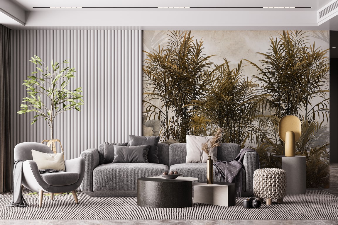 Höga tropiska växter är ett motiv som passar perfekt i vardagsrummet, sovrummet eller på kontoret. Med intensiva gröna nyanser och originella växtformer får interiören nytt liv och blir en plats full av energi.