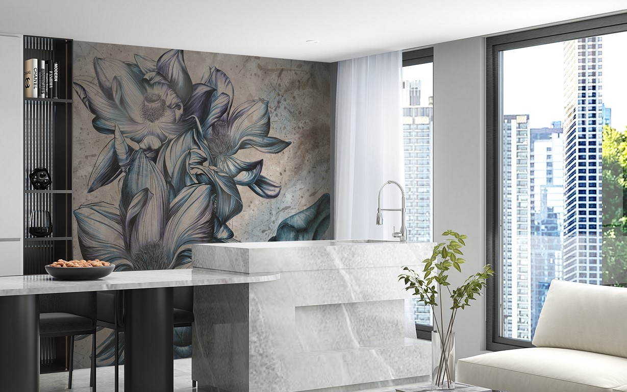 uttrycksfulla motiv i inredningar. Den fångar blicken med stora blommor som hålls i