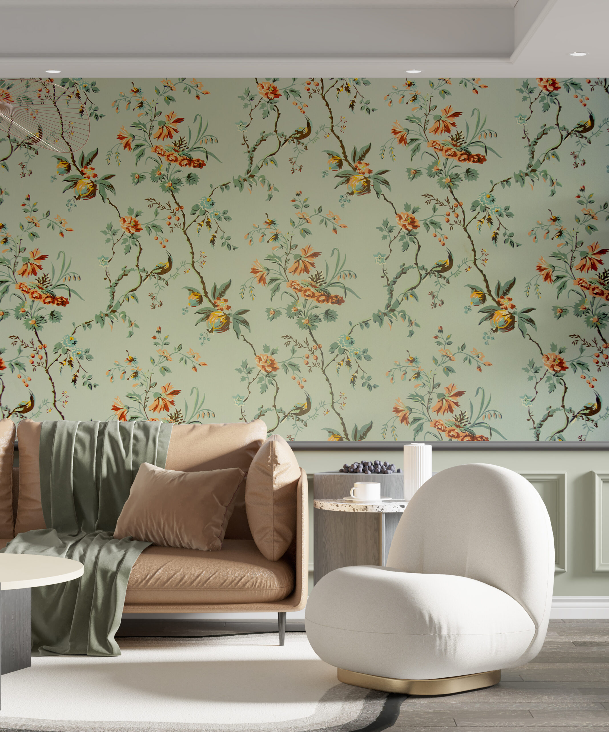 Denna väggmålning domineras av en intensiv orange färg som ger hela utrymmet en mysig och varm känsla. De blommiga motiven tillför delikatess och subtilitet, mjukar upp helheten perfekt och introducerar ett naturelement i inredningen.