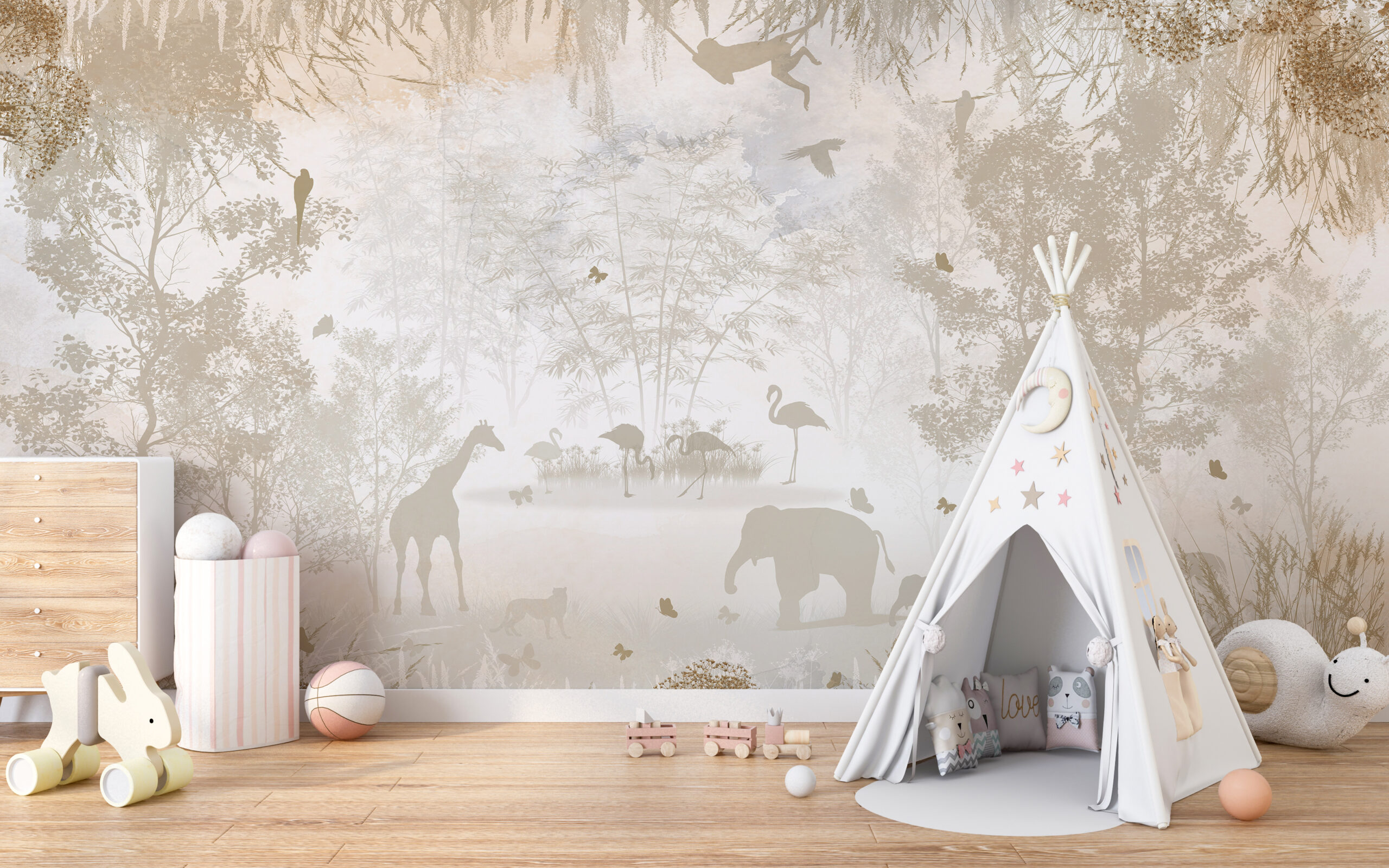 I denna väggmålning kan du njuta av de olika skuggorna av exotiska djur som apor, fåglar eller exotiska insekter. Deras fina konturer i kombination med den gröna vegetationen gör att det hela ser mycket naturligt och realistiskt ut.