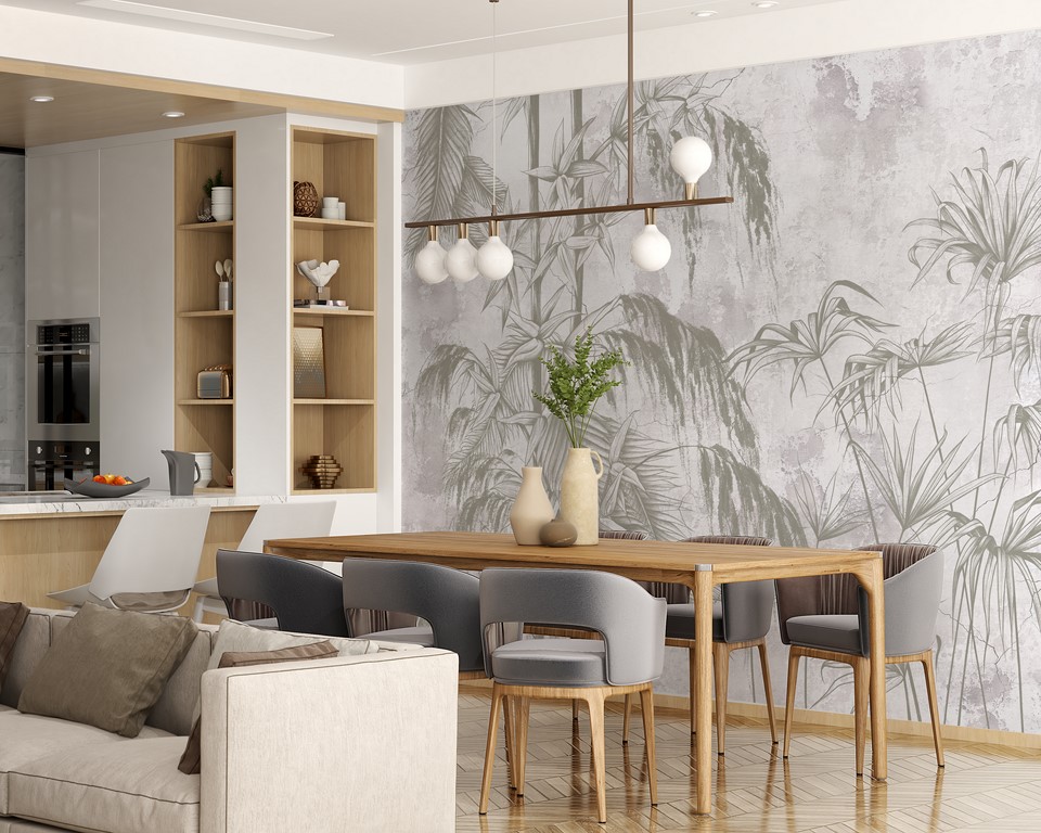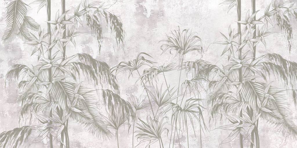 En väggmålning som har utformats för tropiska växtälskare som letar efter mångsidiga, eleganta lösningar. Den grå färgtonen kan enkelt kombineras med inredningsdetaljer i andra färger. Den kan med fördel kombineras med pastellfärger och blir en utmärkt kombination med orange, rött eller guld. Det ger nästan obegränsade designmöjligheter. Tillverkad för att se bra ut även långt efter installationen.