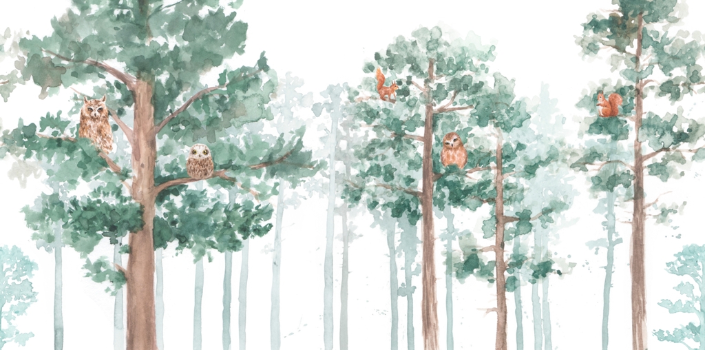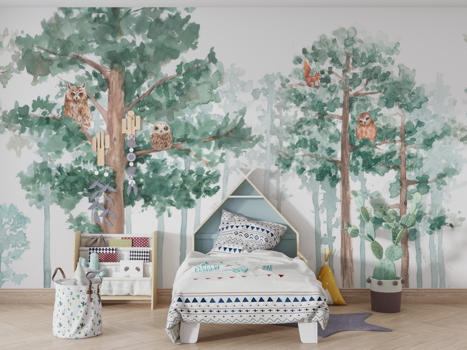 Ta med naturen tillbaka in i ditt hem med denna vackra väggmålning som kommer att transportera dig till den magiska världen av skogsugglor och träd.