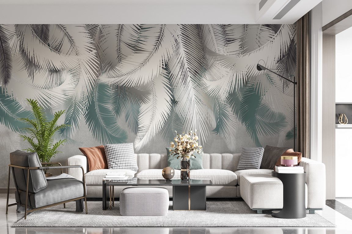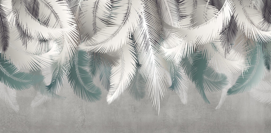 Denna vackra väggmålning har känsliga ormbunksblad i pastellfärgade nyanser av vitt. Med sin subtila och eleganta design blir den ett perfekt komplement till alla inredningar och ger dem en fräsch och lätt känsla.