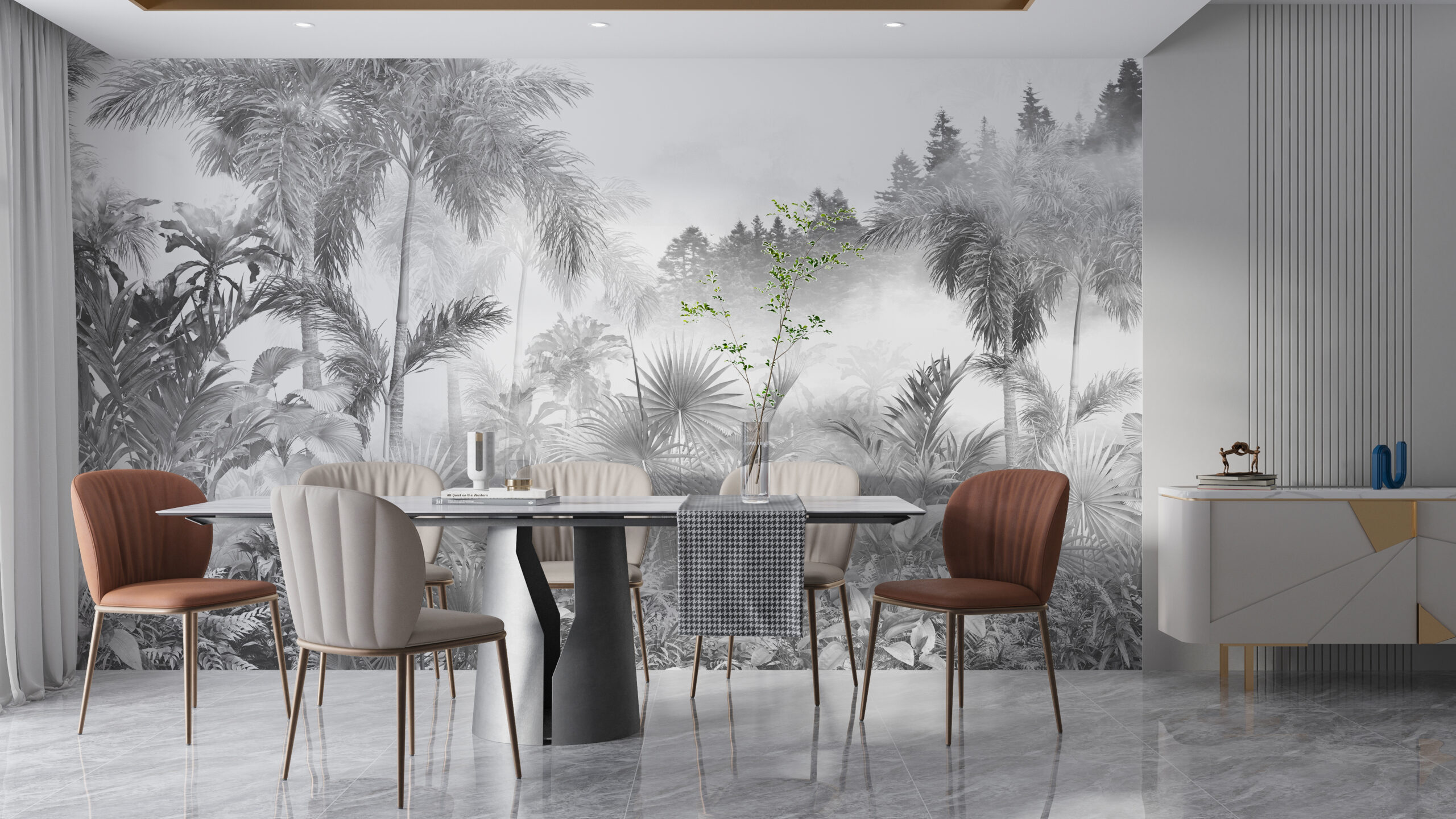 Unna dig en stunds avkoppling och njutning genom att titta på detta vackra landskap varje dag. Fototapeten Jungle White kommer att ge nytt liv och inspiration till din interiör. Upptäck vildmarkens magi utan att lämna hemmet!